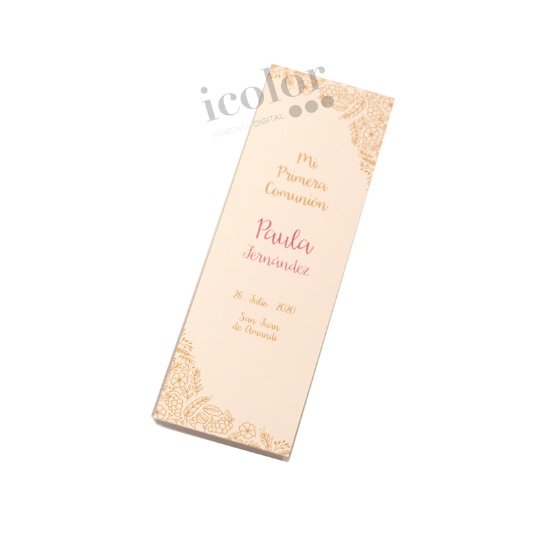 La colección de recordatorios de comunión flores tiene cuatro motivos para elegir, así como el color de la letra es totalmente personalizada.
