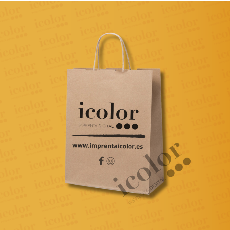 Bolsa de papel personalizada con logotipo mediana de acabado natural de 100g/m2 con asas cortas reforzadas y fuelle. Resistencia hasta 7kg de peso.