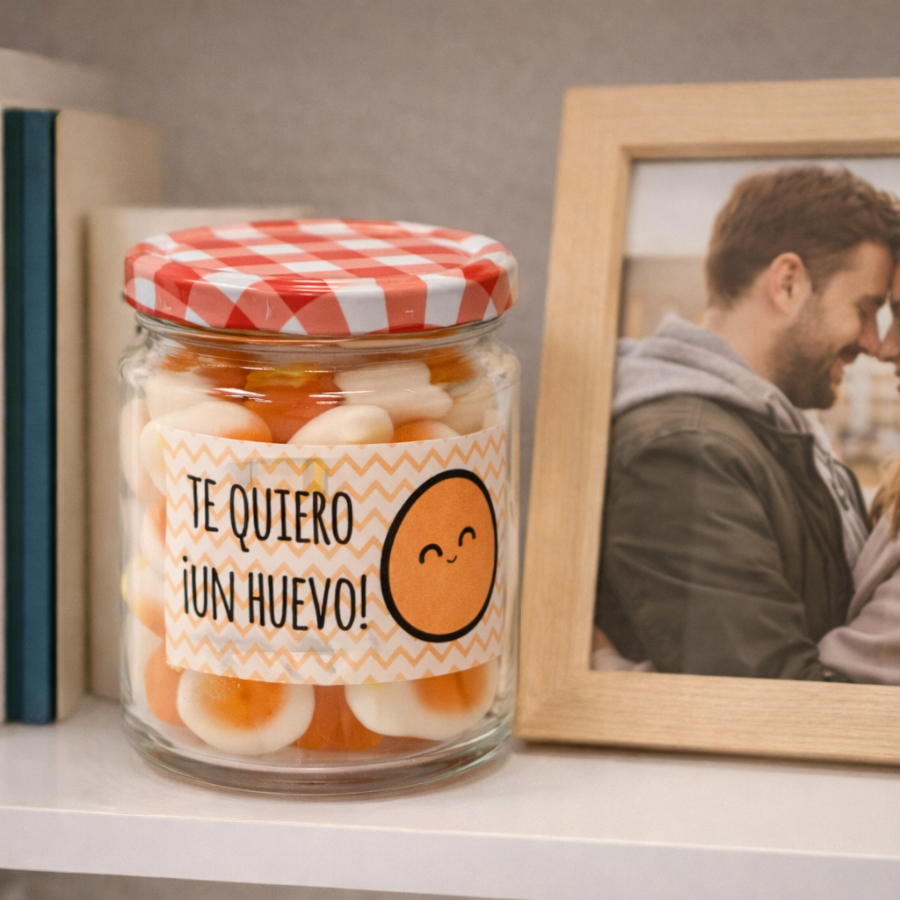 Bote de cristal con tapa para chuches «te quiero un huevo».