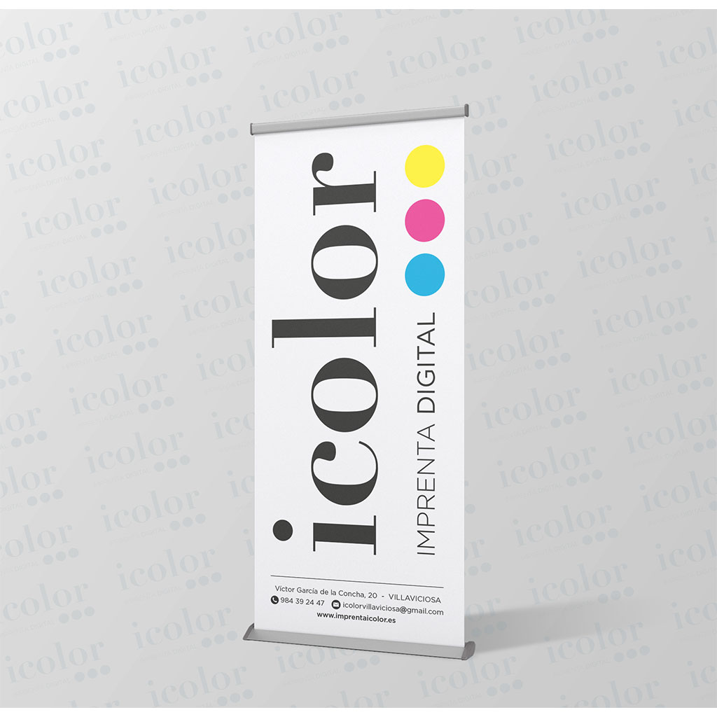Roll up personalizado estándar de gama media-alta con estructura inferior de aluminio en color plata.